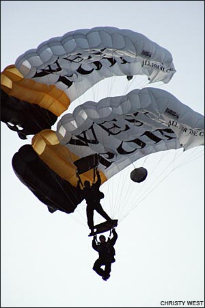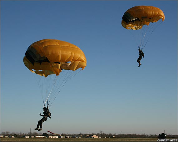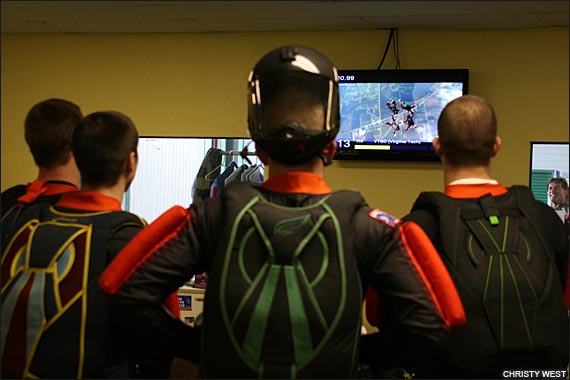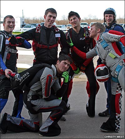 Event DatesDec. 28, 2009-Jan. 2, 2010 at Skydive Spaceland 2009 Collegiate Championships Blog/NewsSATURDAY, JANUARY 2, 2010Collegiates, Day 5 (Saturday)8:30 a.m.: Good morning everyone, it's a beautiful frosty day here at Skydive Spaceland! 6-way speed has rocked and rolled round 1, and as promised we're switching back to 4-way and vertical formation skydiving. Scores are now updated through round 3 of 4-way open. VTSD is kicking butt and taking names; they've opened up a 7-point lead over Air Force Groove, who is 11 points up on West Point Apocalypse. Anything could certainly happen with three rounds to go, but it will be a tall order to make up 7 or more points on VTSD to knock them off the top.