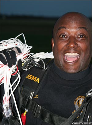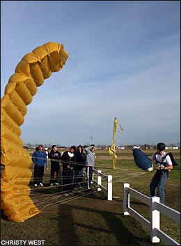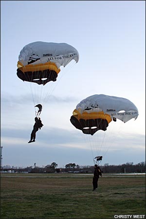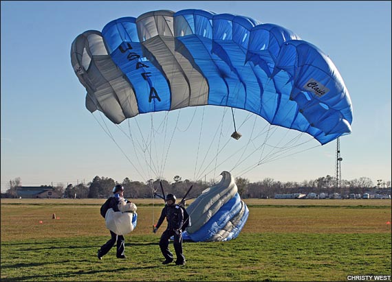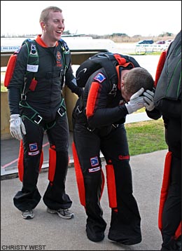 2:35 p.m.: We've got 2-way vertical formation skydiving scores! And we don't just have a few of them, we've got them ALL! Enturbulators bested the Sky Monkeys (U.S. Air Force Academy) by one point to win the gold with 54 points, and another USAFA team, the Krispy Robots, takes bronze with a 49. Congrats, everyone, nice flying! We'll get some video of that out to you shortly. This just in, VTSD has unofficially scored a 31 in round 5! Draw: O-6 (satellite - cat+acc). Can't wait to see what they do with round 6 (P-B-J)... anyone want a sandwich? :-) 3:25 p.m.: We've got rounds 4 and 5 of 4-way completely judged, and VTSD continues to widen their lead in the open class, besting Air Force Groove by 7 points in round 4 and 13 points in round 5 (wow) to gain a current total of 104 points. That puts them ahead by 27 points after 5 rounds; looks like they don't want to be caught anytime soon... Groove's total of 77 points puts them 7 points up on West Point Apocalypse, who is 23 points ahead of Air Force Epic. Barring some really interesting developments, it looks like the first three places might be pretty locked up in 4-way open. In Advanced, Air Force Impulse topped their nearest neighbors West Point Vigilantes by 5 points in round 4 but lost one in round 5, keeping them in first by 8 points. The race is on for third, with West Point Abroad 8 points behind Vigilantes and Eminence and Vendetta tied only one point back. 3:45 p.m.: We've just heard an announcement that accuracy is complete, so the scores we have are now final. The last 4-way loads are in the air now, so all we have left to complete is 6-way. Stand by for more scores! 6:10 p.m.: Hey all, we're obviously done for the day... it's been a great day! We completed the meet with all 6 rounds of 4-way, all 3 rounds each of 2-way and 6-way, all 4 rounds of VFS, 3/4 rounds of classic accuracy, and 2/4 rounds of sport accuracy. We apologize, again, for the delay in posting updates. Personal opinion from the blogger: Our webhost would benefit from a bat upside the head. Photos from today...